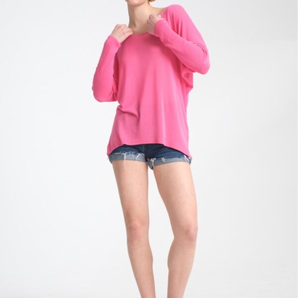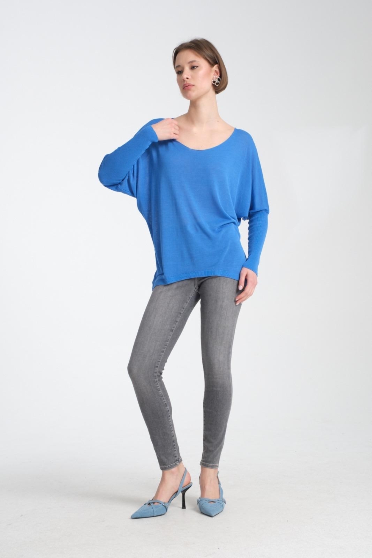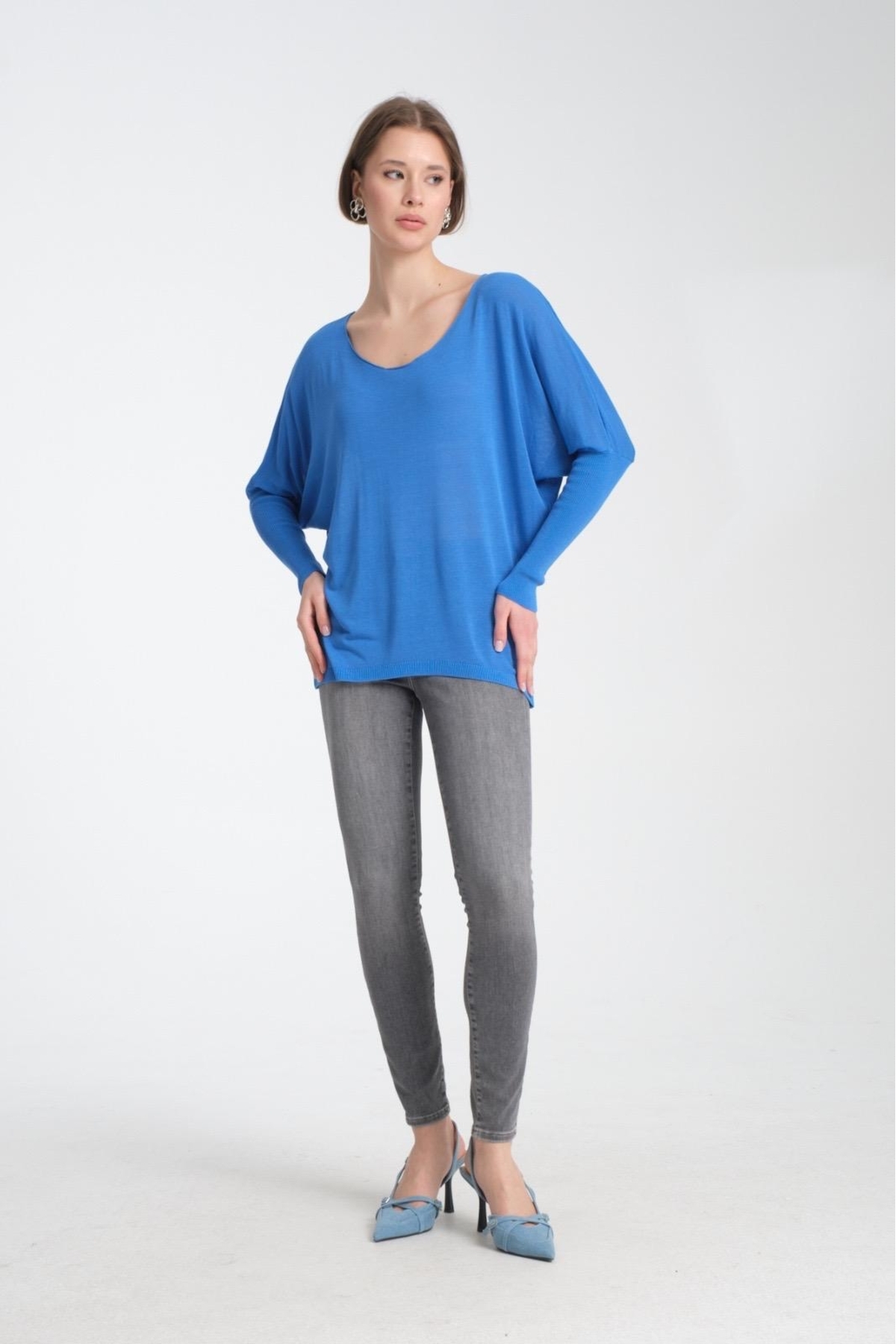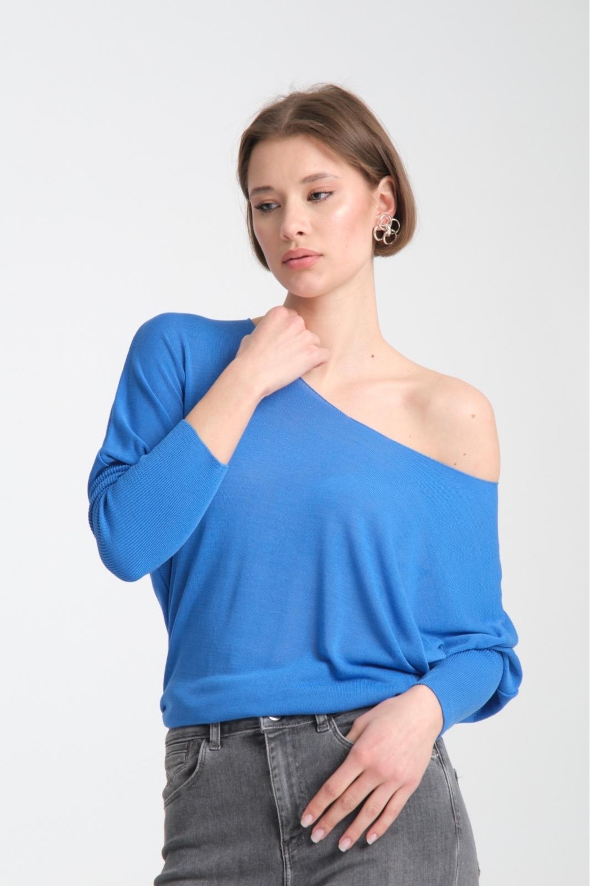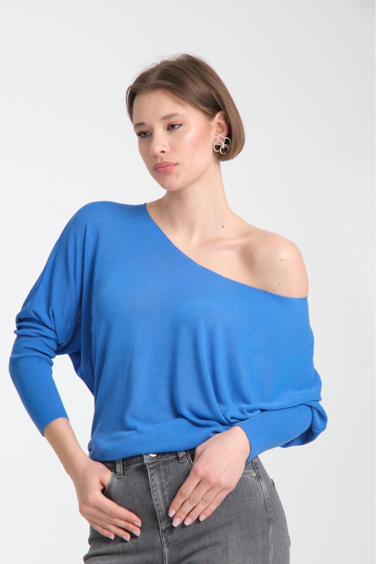 Kadın Giyim Bluz Ince Yazlık Kazak U Yaka Omuz Düşük Uzunkol Rahat Kalıp Ince Viskon Üst Giyim