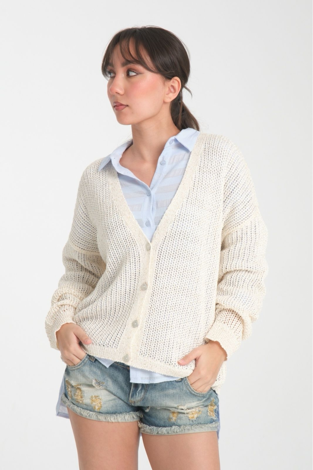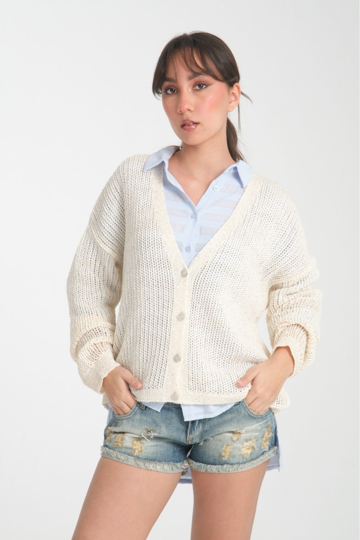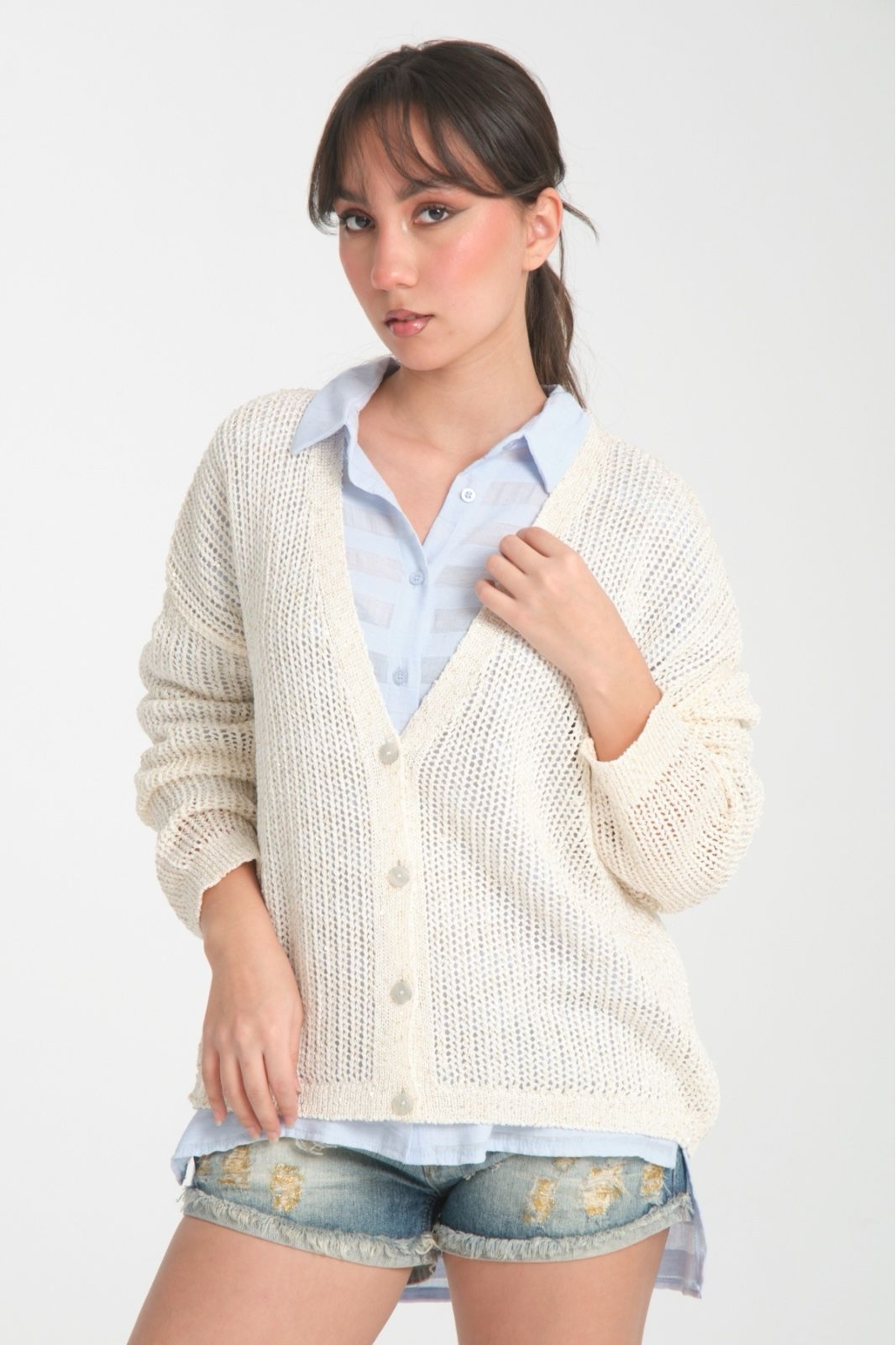 kadın hırka ince pullu v yaka düğmeli rahat kalıp şık hırka