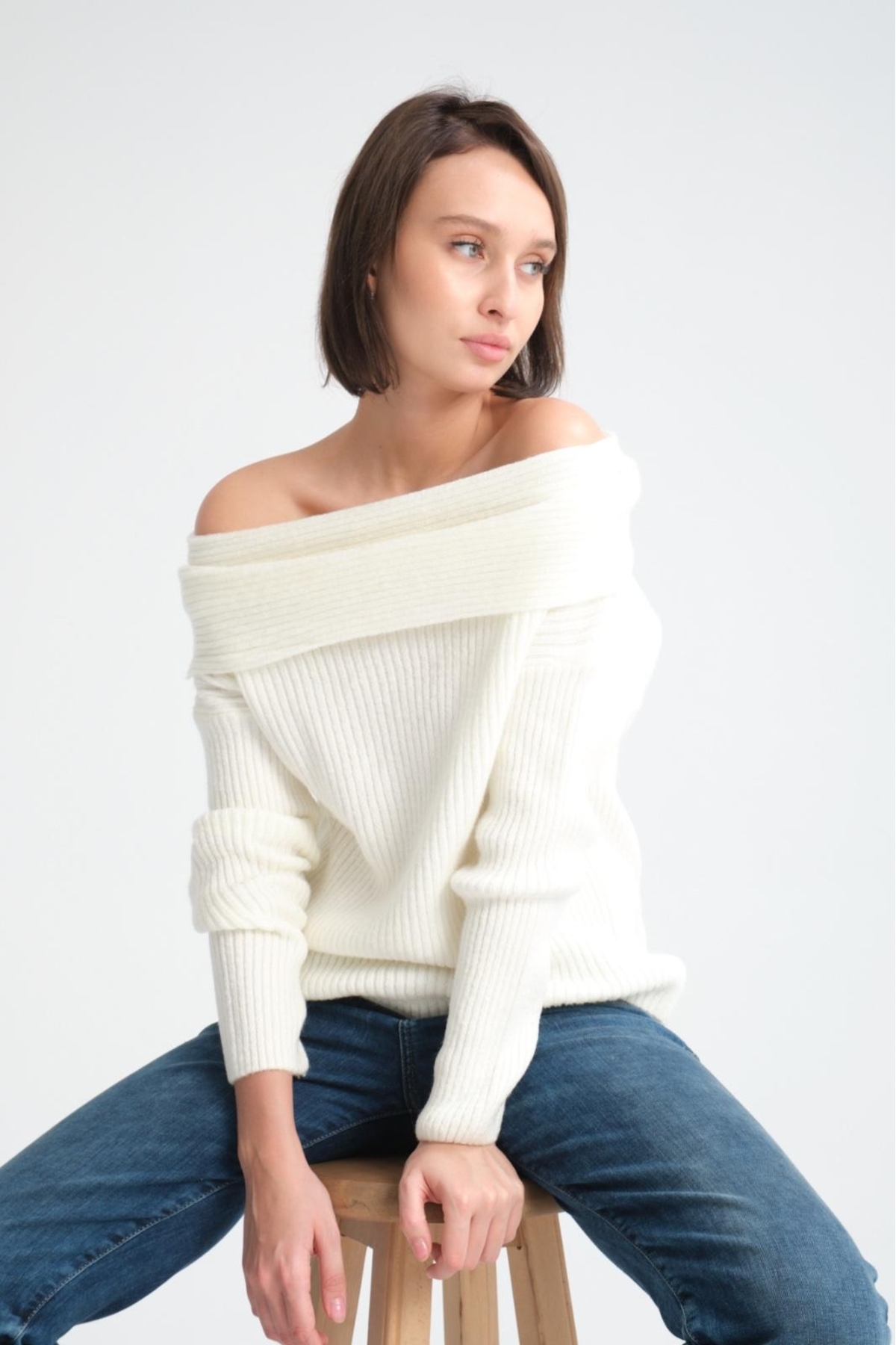 kadın yumoş kalın yumuşak Madonna yaka şık triko uzun kol kazak