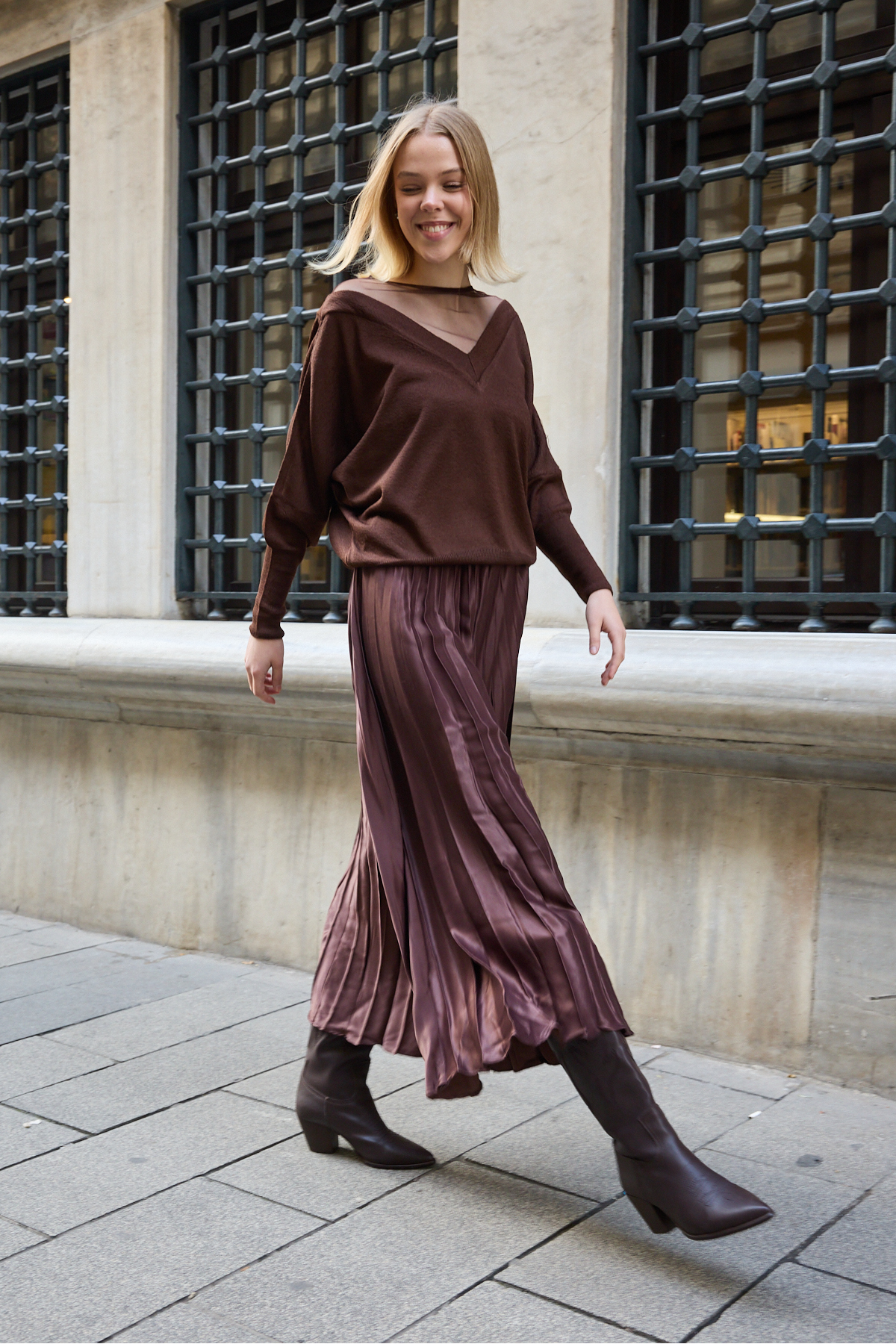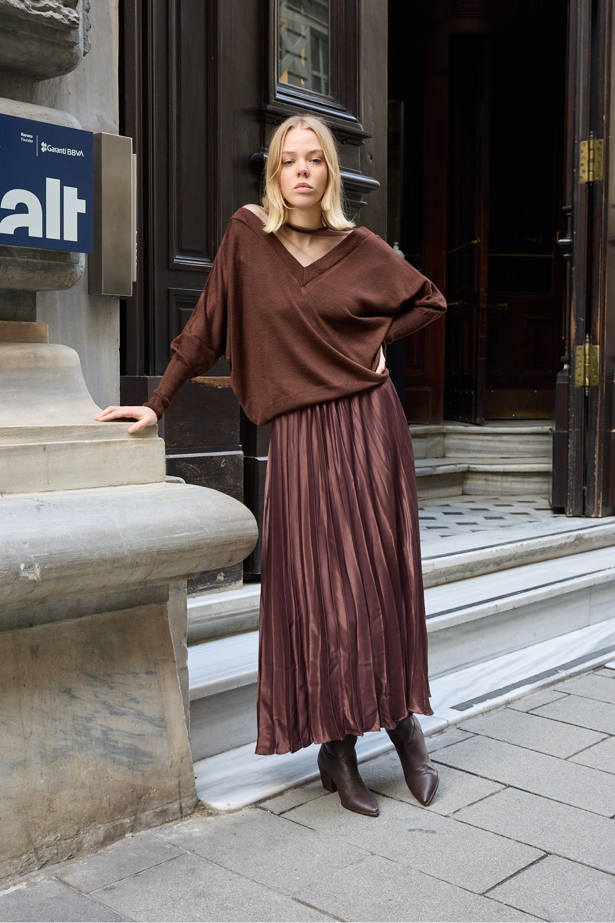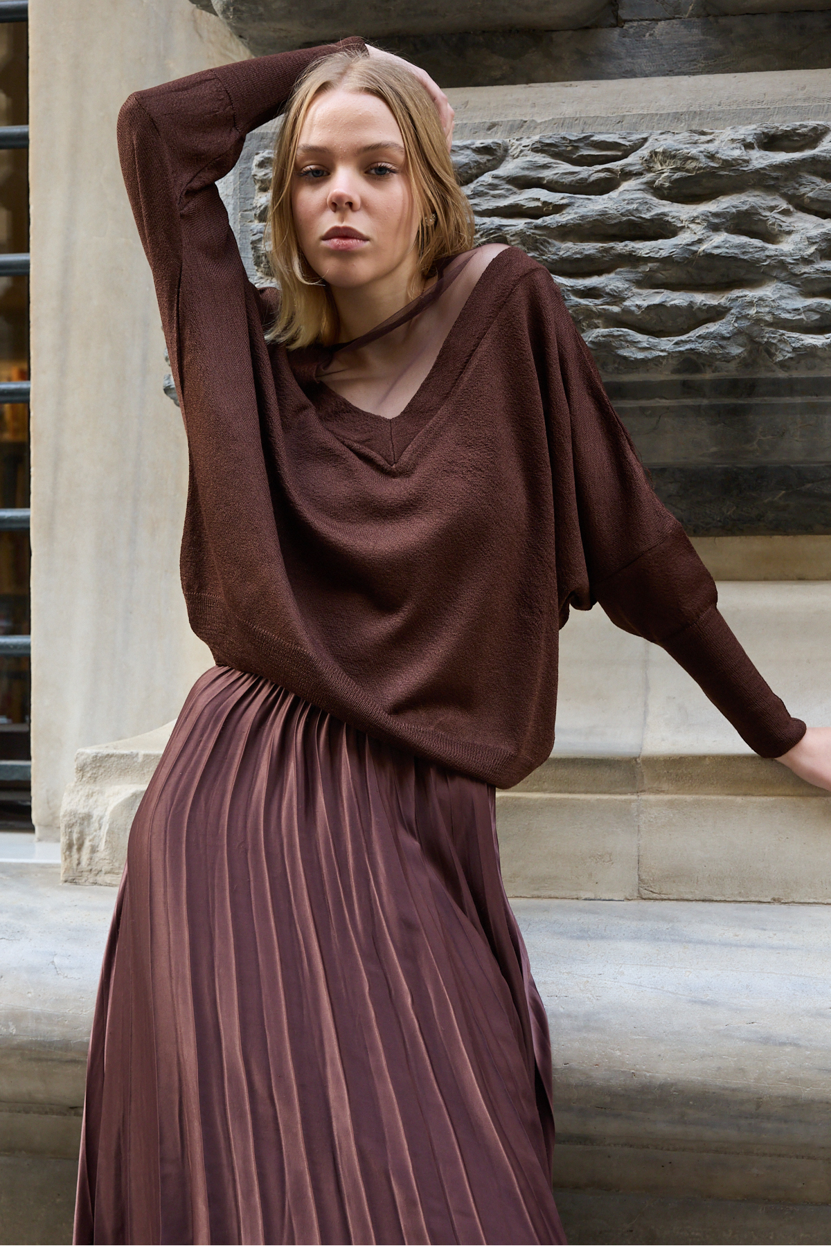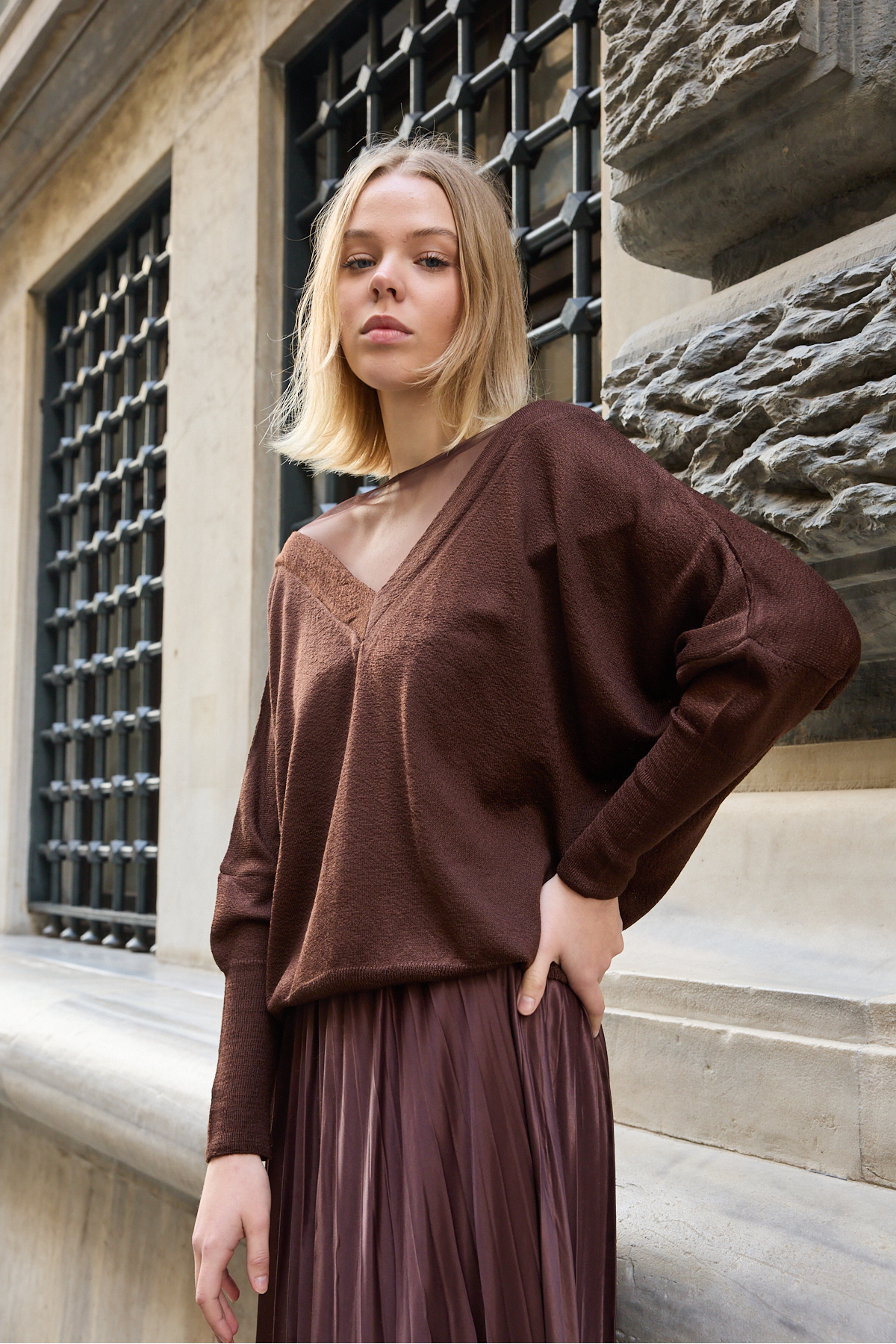 Yakası Tül Detaylı Ön Arka V Yaka Merserize Triko Kadın Kazak